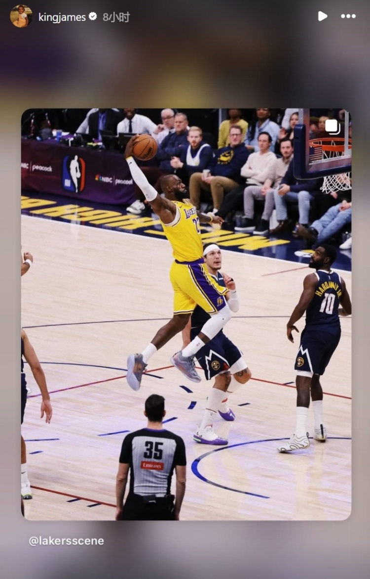 不过,詹姆斯似乎没有受到该文章的影响,他几个小时后在INS晒出了自己在对阵掘金时的隔扣海报,未配任何文字。