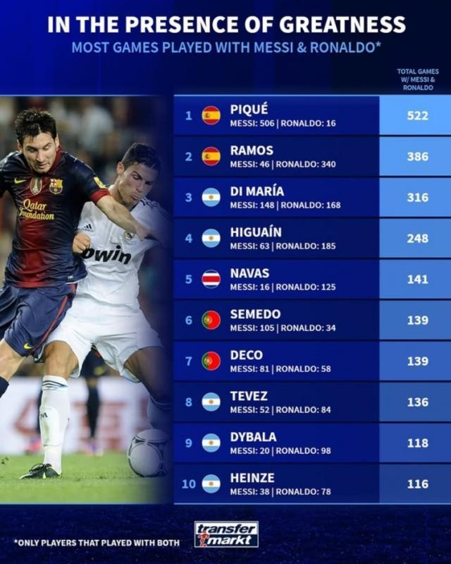 1.皮克,与梅西同场506次,与C罗同场16次,合计522次