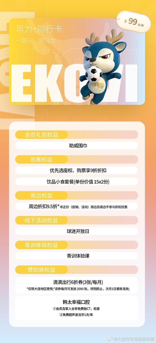 北京时间3月12日,据大连可为官方消息,大连可为官方小程序正式上线,俱乐部还公开招募可为大会员。大连可为共推出五档不同价位的会员,各档位卡种均搭配观赛、周边、线下活动、青训体验及赞助商专属权益,且权益随卡种价位提升逐步升级。初心卡:9.9元/年同行卡:99元/年逐风卡:666元/年笃信卡:...