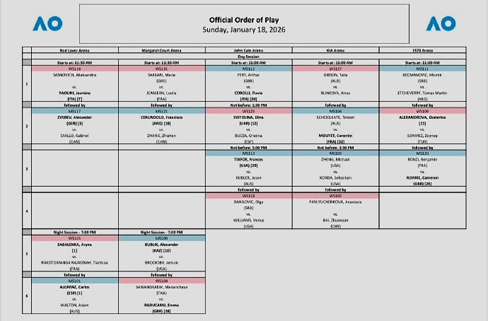 北京时间明天早上8点,2026赛季澳大利亚网球公开赛的大幕将在墨尔本开启。中心球场的揭幕战由萨斯诺维奇和鲍里妮打响。女单头号种子萨巴伦卡坐镇夜场,男单头号种子阿尔卡拉斯紧随其后。大威廉姆斯、拉杜卡努、亚历山德洛娃、万卓索娃、小兹维列夫、布勃利克等名将也将登场亮相。